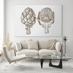 Tablou pe sticlă - Desen botanic al unei anghinare în întregime și în secțiune transversală - 70x50cm - Lecție de anatomie - Decorațiune modernă pentru perete pentru living și dormitor ARTTOR