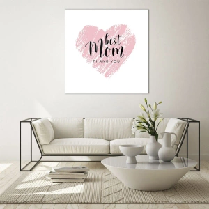 Tablou pe sticlă - O inimă roz cu cuvintele „Cea mai bună mamă” pe un fundal alb - 70x50cm - Întotdeauna la momentul potrivit - Decorațiune modernă pentru perete pentru living și dormitor ARTTOR