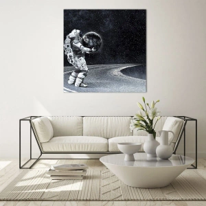 Tablou pe sticlă - Un astronaut care poartă Pământul în drumul său prin univers - 70x50cm - Pe Calea Lactee - Decorațiune modernă pentru perete pentru living și dormitor ARTTOR