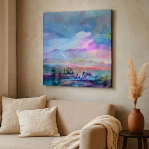 - Un peisaj montan artistic cu cer în culori pastelate și un mic sat cuibărit în vale. Această pictură este plină de armonie și liniște, perfectă pentru decorarea interioarelor inspirate de natură.