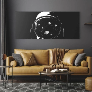 Tablou pe sticlă - Astronaut cu stele și planete în cască pe fundal negru - 70x50cm - Mișto priveliște - Decorațiune modernă pentru perete pentru living și dormitor ARTTOR
