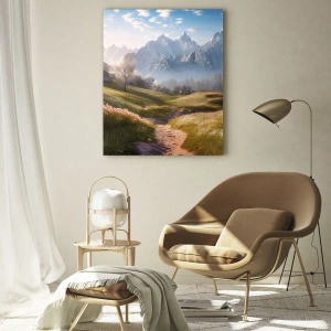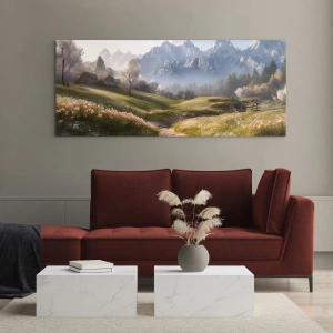 Tablou de perete - Vale idilică - Peisaj de primăvară cu o vale, flori și munți în fundal dimineața