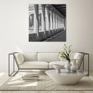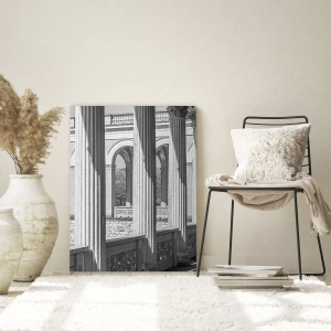 - Pictura alb-negru înfățișează o colonadă clasică cu o perspectivă profundă și un joc ritmic de lumini și umbre. Compoziția reflectă armonia arhitecturii și stilul său atemporal.
