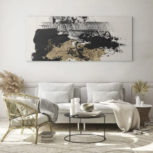 - O compoziție artistică în nuanțe de negru și auriu pe un fundal deschis. Această abstracție expresivă este perfectă pentru interioare elegante și moderne.