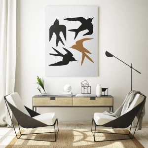 - O compoziție delicată și elegantă, cu patru rândunele zburătoare, într-un design minimalist. Combinația de negru, alb și maro adaugă o notă subtilă. O decorațiune perfectă pentru perete, potrivită pentru iubitorii de natură și simplitate.