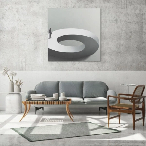 - O compoziție monocromatică ce prezintă silueta unui bărbat care stă pe un inel alb mare. O pictură cu un mesaj simbolic puternic, în stil minimalist, perfectă pentru interioare moderne și reflexive.
