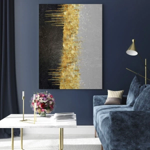 - O pictură abstractă modernă cu o culoare aurie dominantă și contraste între negru și gri. O decorațiune elegantă pentru interioare elegante.
