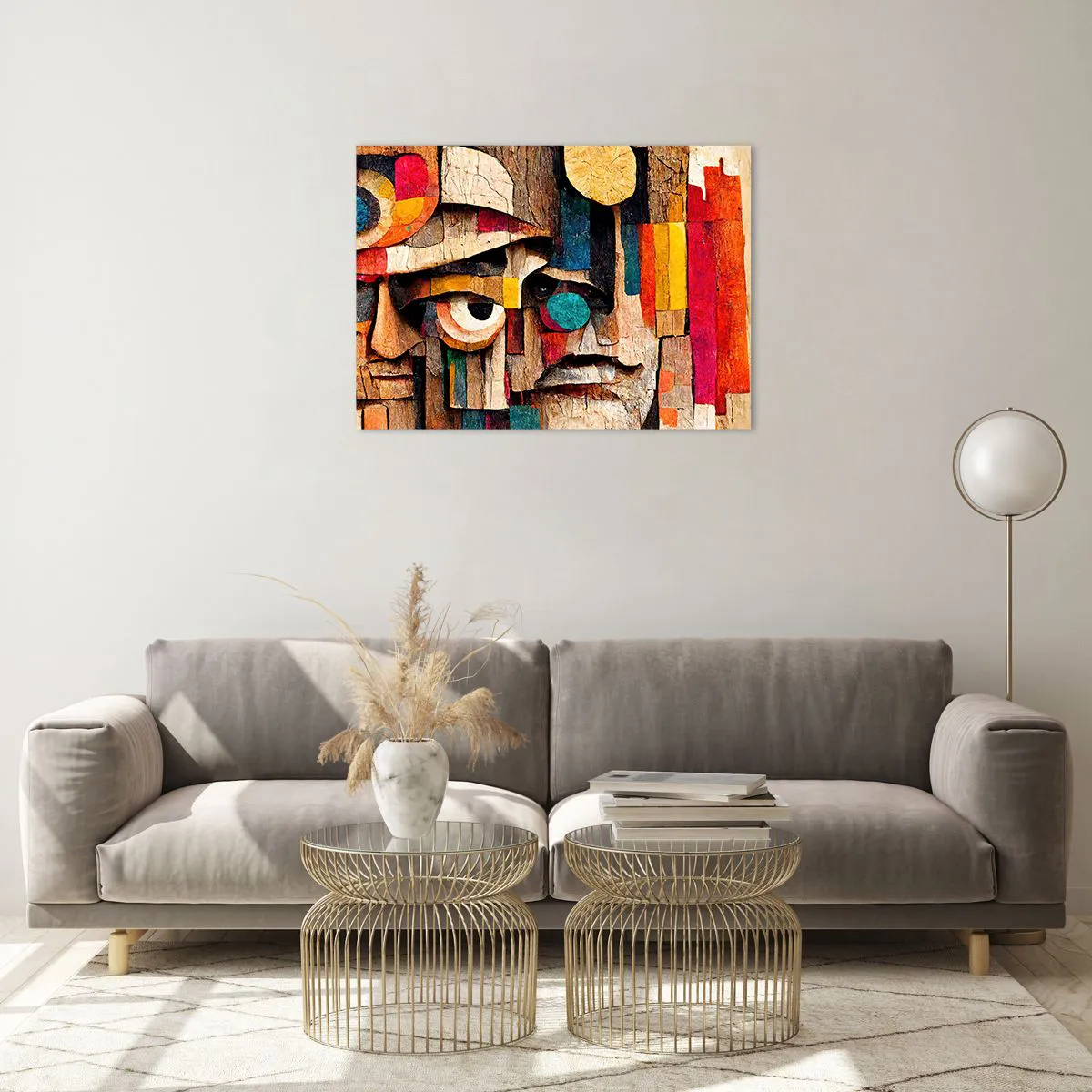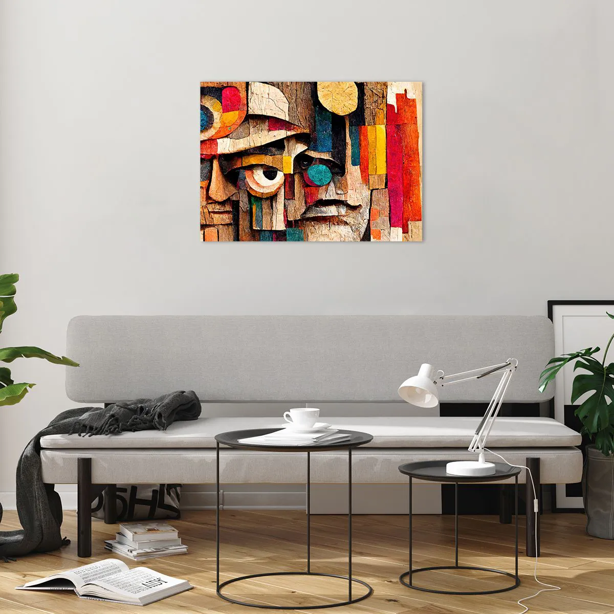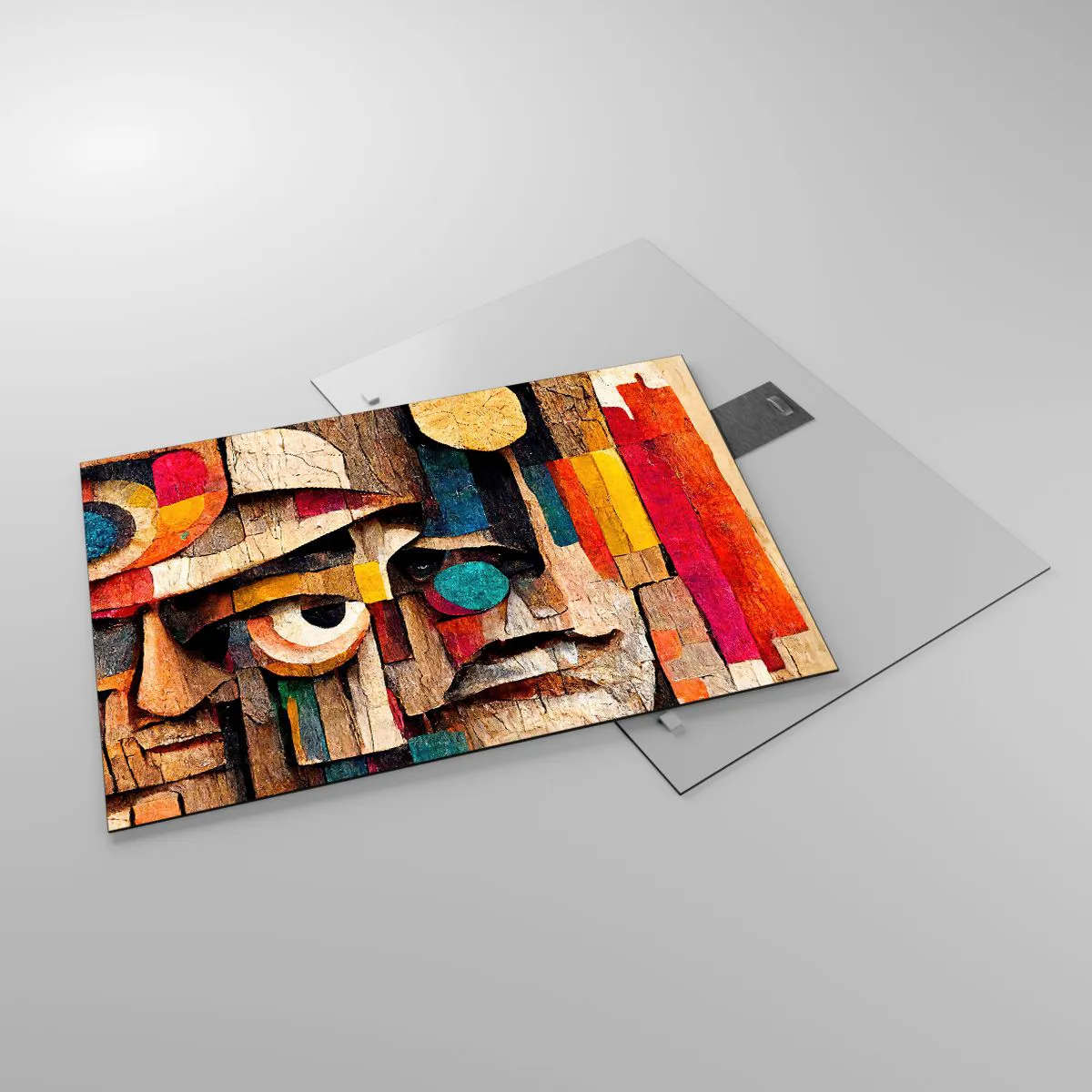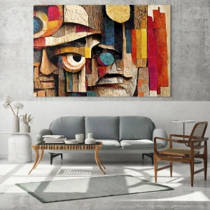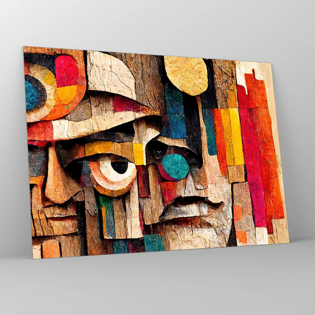 - O compoziție abstractă cu forme geometrice în culori vibrante și o textură asemănătoare lemnului. Formele sale expresive și mozaicul artistic creează o decorațiune remarcabilă pentru interioarele moderne.