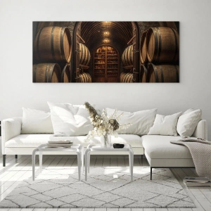 Tablou pe sticlă - O vie cu butoaie și o pivniță luminată plină de sticle - 70x50cm - Beciul cu atmosferă - Decorațiune modernă pentru perete pentru living și dormitor ARTTOR
