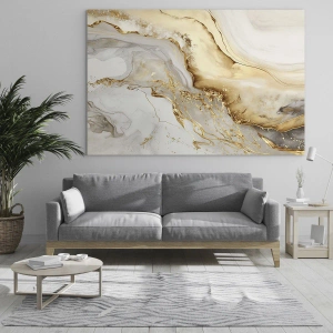 - Pictura prezintă dungi aurii abstracte și tonuri de bej pe un fundal deschis. Compoziția captivează prin eleganța, subtilitatea și expresia artistică modernă.