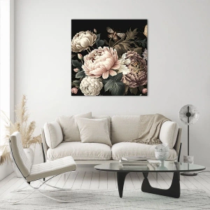 - O compoziție de flori pastelate și fluturi pe un fundal negru intens. Această pictură are un stil clasic și elegant - perfectă pentru interioare rafinate, inspirate de natură.