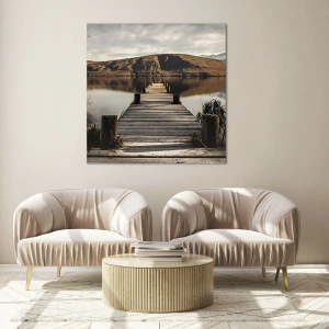 - Pictura înfățișează un dig de lemn deasupra unui lac liniștit, cu un peisaj montan în fundal. Un peisaj plin de liniște și armonie, perfect atât pentru interioarele moderne, cât și pentru cele rustice.