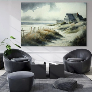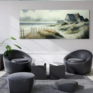 Tablou pe sticlă - Case pe malul mării, pe dune, sub un cer înnorat - 70x50cm - Departe de agitație - Decorațiune modernă pentru perete pentru living și dormitor ARTTOR