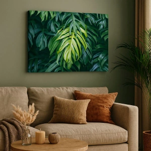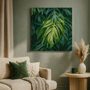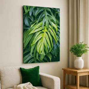 - Frunzele verzi tropicale într-un aranjament dens atrag atenția prin armonia și prospețimea lor. O decorațiune de perete ideală pentru iubitorii de natură.