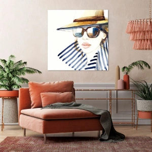 - Un portret elegant al unei femei purtând o pălărie și ochelari de soare mari. Realizat în stil acuarelă, cu nuanțe subtile de albastru și alb, acest tablou este o completare perfectă pentru orice interior modern.