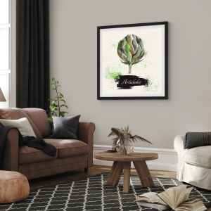 Poster în ramă neagră - Ilustrație în acuarelă a unei anghinare pe un fundal deschis - 50x70cm - Trăiască legumele! - Decorațiune modernă pentru perete pentru living și dormitor ARTTOR