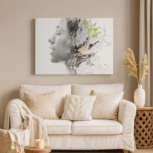 Cufundat în natură este o pictură unică pe pânză care înfățișează un profil subtil al unei femei integrat într-un colaj artistic inspirat de natură. Compoziția combină detalii delicate de negru cu elemente desenate, cum ar fi frunzele și alte motive organice, care adaugă armonie și eleganță lucrării. Nuanțele dominante de alb și negru, completate de accente subtile de verde și bej, creează o atmosferă unică.