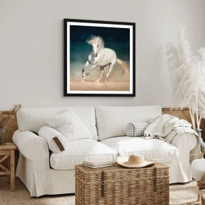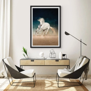 Poster în ramă neagră - Un cal alb galopând pe pământul nisipos - 50x70cm - Libertate în stare pură - Decorațiune modernă pentru perete pentru living și dormitor ARTTOR