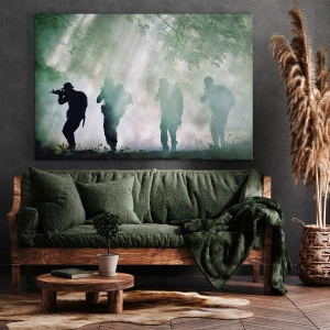 - Siluete de soldați într-o pădure învăluită în ceață creează un peisaj misterios și expresiv. O decorațiune perfectă pentru a introduce caracter și inspirație.