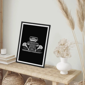 - Un poster elegant, alb-negru, care înfățișează o mașină clasică. Perfect pentru pasionații de mașini și interioarele minimaliste.
