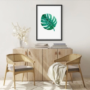 Poster în ramă neagră - Ilustrație în acuarelă a unei frunze de monstera pe fundal alb - 50x70cm - Conceptul verde - Decorațiune modernă pentru perete pentru living și dormitor ARTTOR