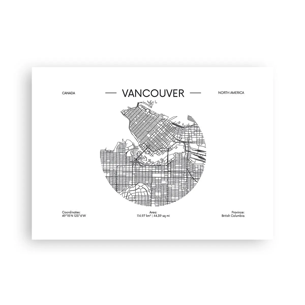 • Hartă, Vancouver, Canada, Alb-negru, hărți ale lumii, orașe, călătorii, tipografie și citate, Pentru birou, Pentru birou, Pentru sufragerie, Pentru hol, Pentru living, Pentru dormitor, Alb, negru, alb și negru, Orizontal