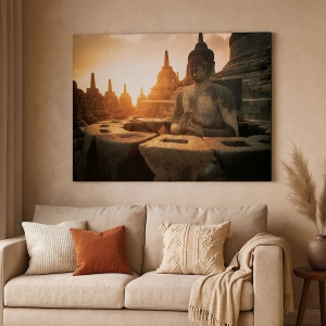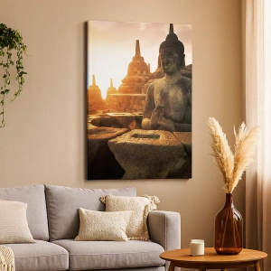 - Această imprimare pe pânză înfățișează o statuie a lui Buddha la Templul Borobudur, pe fundalul unui apus de soare. Atmosfera sa exotică și spirituală completează perfect interioarele propice relaxării și meditației.