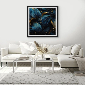 Poster în ramă neagră - Frunze aurii pe un fundal albastru marin intens - 50x70cm - Căptușită cu aur - Decorațiune modernă pentru perete pentru living și dormitor ARTTOR