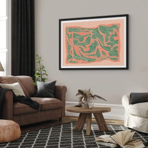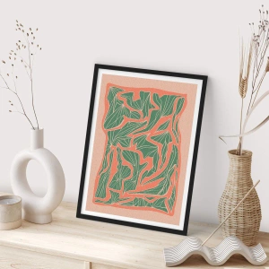 Poster în ramă neagră - Model abstract de frunze în nuanțe de verde și teracotă - 50x70cm - Lupta dintre coral și verde - Decorațiune modernă pentru perete pentru living și dormitor ARTTOR