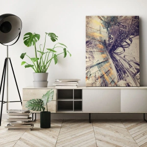 • Pictura prezintă o abstracție dinamică în nuanțe de bej și violet, ce combină modernitatea și expresia artistică, perfectă ca decor pentru un birou sau o sufragerie.