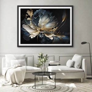 Poster în ramă neagră - Un aranjament floral abstract elegant în auriu și albastru marin. - 50x70cm - Povestea unei flori de iubire - Decorațiune modernă pentru perete pentru living și dormitor ARTTOR
