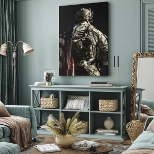 - Pictura înfățișează un soldat în uniformă cu un steag pe un fundal întunecat, subliniind simbolismul patriotismului și al forței. Este o decorațiune ideală pentru interioarele moderne.
