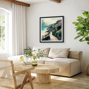 Poster în ramă neagră - O pitorească alee de coastă în stil acuarelă - 50x70cm - Orășel mediteraneean - Decorațiune modernă pentru perete pentru living și dormitor ARTTOR