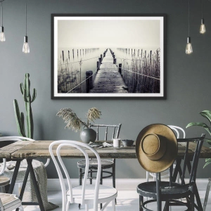 - Posterul înfățișează un dig de lemn care duce într-o întindere de apă cețoasă. Estetica sa minimalistă și culorile subtile creează o atmosferă de pace și reflecție.