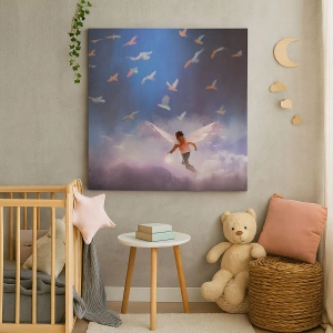 Tablou de perete - Ai nevoie de imaginație și curaj - O figură cu aripi de înger plutind printre păsări pe fundalul cerului