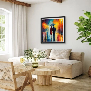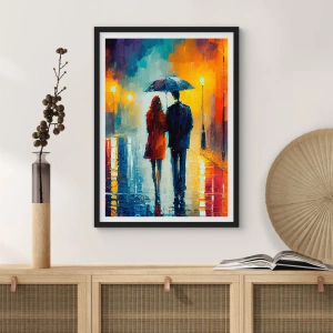 Un cuplu ținând o umbrelă merge pe o stradă ploioasă, creând o atmosferă romantică într-un cadru urban. Acest poster înrămat, produs de ARTTOR, este decorațiunea perfectă pentru spații moderne, cum ar fi un living sau un dormitor.