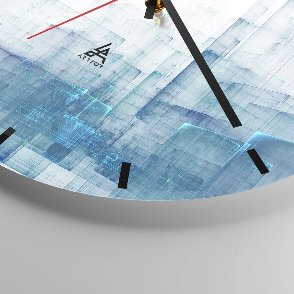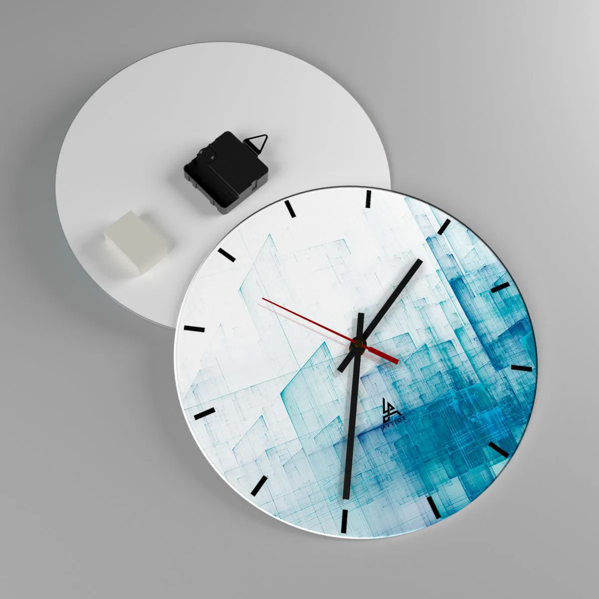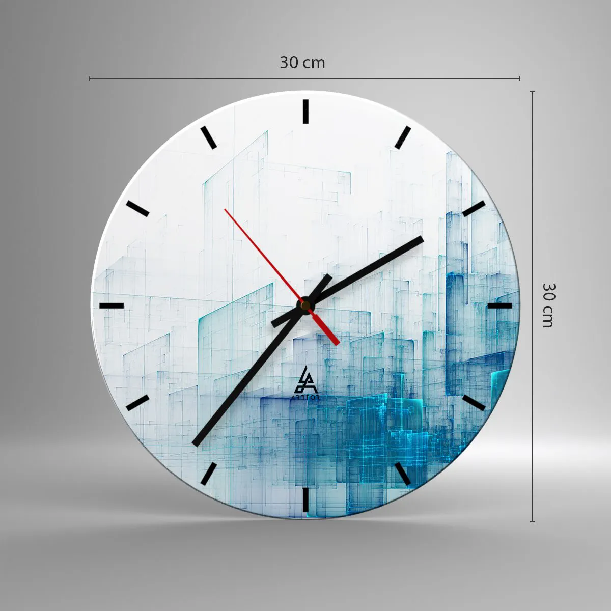 • viziune abstractă a spațiului compusă din forme geometrice în nuanțe de albastru pe un fundal alb. Acest ceas rotund este realizat din sticlă, având dimensiunile de 30x30 cm. Perfect pentru interioare moderne și tehnologice.