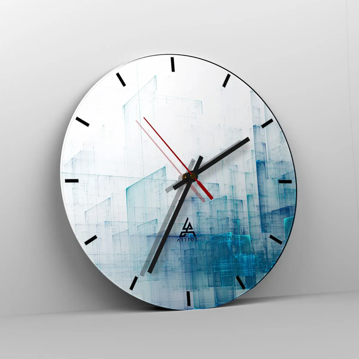 Ceas de perete - Ceas pe sticlă - Forme geometrice abstracte în tonuri de albastru pe fundal alb - 30x30cm - Cum a apărut spațiul - Decorațiune modernă pentru perete pentru living, bucătărie și dormitor ARTTOR