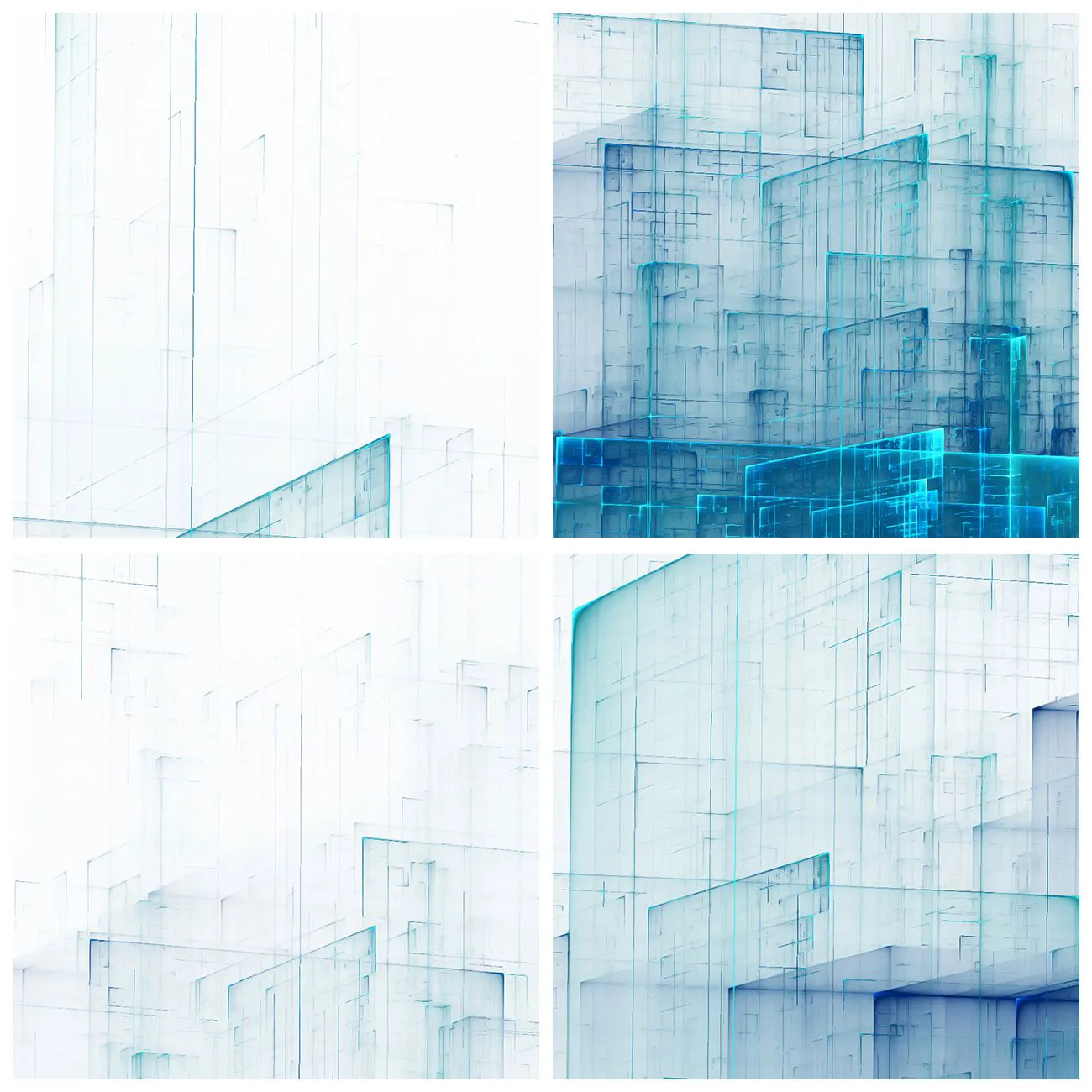 Elementul central al picturii este un aranjament de forme repetitive - blocuri transparente, geometrice, care se aranjează într-un ritm sugestiv. Geometria devine un instrument pentru construirea unui spațiu imaginat, unde albastrul simbolizează răceala, tehnologia și, în același timp, pacea și profunzimea. Acest motiv surprinde spiritul modernității, progresului tehnologic și armoniei formei.