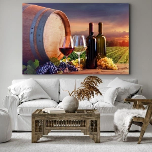 - O compoziție care înfățișează un butoi, pahare de vin și struguri pe fundalul unui peisaj pitoresc. Această pictură emană eleganță și armonie, perfectă pentru interioare elegante.