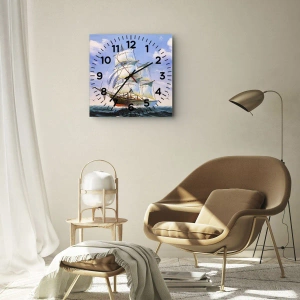 Ceas de perete - Ceas pe sticlă - Bărci cu pânze pictate pe o mare furtunoasă sub un cer albastru - 30x30cm - Cu mândrie în vânt - Decorațiune modernă pentru perete pentru living, bucătărie și dormitor ARTTOR