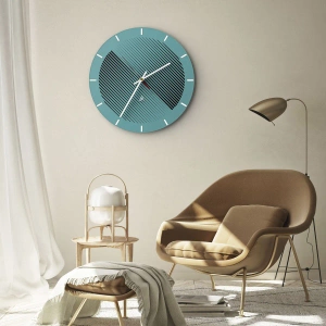 Ceas de perete - Ceas pe sticlă - Fundal turcoaz cu linii diagonale negre într-un aranjament geometric - 30x30cm - Cercul - o variație geometrică - Decorațiune modernă pentru perete pentru living, bucătărie și dormitor ARTTOR