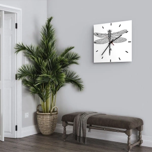 - Un ceas de perete din sticlă de 30x30 cm, cu un design precis, alb-negru, cu libelule. Un design decorativ delicat și elegant, inspirat de lumea naturală.