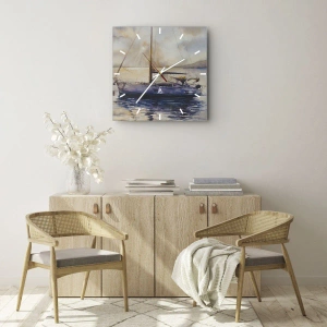 Ceas de perete - Ceas pe sticlă - Un iaht pe apă la apus, în stil acuarelă - 30x30cm - O seară în golf - Decorațiune modernă pentru perete pentru living, bucătărie și dormitor ARTTOR