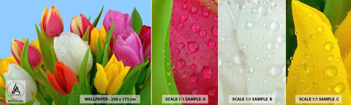 Mostră de Tapet Standard Eco - Un curcubeu floral în picături de rouă - Lalele, Flori, Buchet de flori - 100x30 cm