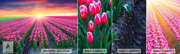 Mostră de Tapet Standard Eco - Ferma de frumusețe - Flori, Lalele, Apus de soare - 100x30 cm
