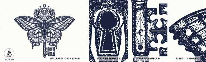 Mostră de Tapet Standard Eco - Toate secretele inimii - Abstracția, Fluture, Cheie - 100x30 cm