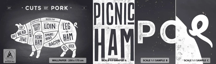Mostră de Tapet Standard Eco - Abecedar de măcelar - Gastronomie, Animal Porc, Porc - 100x30 cm