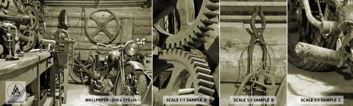 Mostră de Tapet Standard Eco - În șopronul unchiului Vlad - Motocicletă, Atelier de reparatii auto, Epocă - 100x30 cm