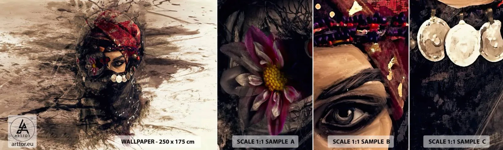 Mostră de Tapet Standard Eco - Cel puțin îngrijător - Abstracția, Chipul de femeie, Simboluri orientale - 100x30 cm
